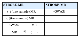 26]. 그러나 STROBE의 일부 항목은 지나치게 일반적이거나 MR 연구에 적용되지 않으며, MR 연구에 중요한 항목이 누락되어 있기도 하다. MR 연구 보고를 개선하기 위해, 우리는 STROBE 지침에 기반을 두되 MR 연구설계에 초점을 맞춘 별도의 체크리스트를 개발하였고, 그 결과가 STROBE-MR 보고지침(strengthening the reporting of observational studies in epidemiology using Mendelian randomization)이다[