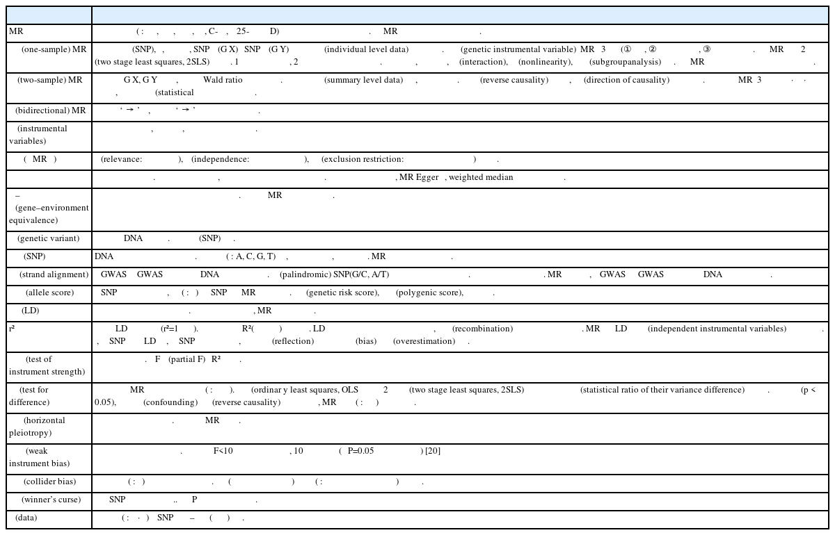 Table 1)로만 국한되지 않지만, 현재 문헌에서는 이러한 유형의 연구가 대다수를 이룬다. MR에서 흔히 사용되는 용어의 용어집은
