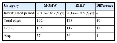 Table 2 compares the outcomes of all first-instance criminal trials involving charges of occupational negligence resulting in death or injury, using 2014–2018 data from the RIHP and 2019–2023 data from the MOHW [