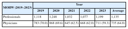 7]. However, no statistical data are available regarding whether these individuals were formally indicted and brought to trial. Of note, the MOHW’s analysis indicates that the number of cases handled by the prosecution during 2019–2023 declined slightly compared with the preceding 5 years. This suggests that although the total number of cases involving physicians charged with occupational negligence resulting in death or injury has remained stable or decreased marginally, the number of first-instance criminal trials and convictions has increased—potentially indicating a shift toward stricter criminal accountability.