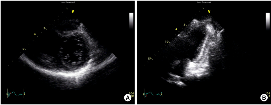 Fig. 1A). In the laboratory findings, serum liver aminotransferase was mildly elevated, with 54 IU/L of aspartate transminase and 31 IU/L of alanine transaminase. Cardiac enzymes were also elevated in concentration, with a CK-MB level of 23.81 ng/mL and troponin T level of 0.98 ng/mL.