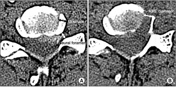 (A) Diameter of the uncinate process is measured at the preoperative axial CT image showing the widest area of the disc. Diameter of the neural foramen was measured at the point just medial to the fossa locating the dorsal root ganglion. (B) Diameter of anterior microforaminotomy is measured on the postoperative axial CT image. AMF, anterior microforaminotomy.