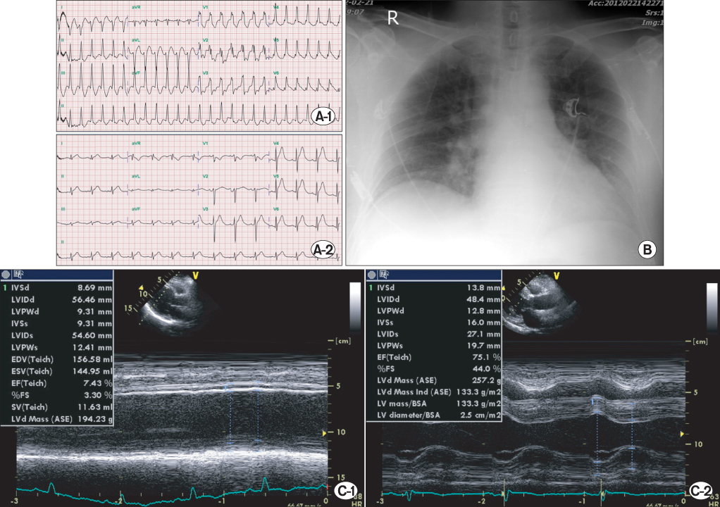 Fig. 3Electrocardiogram (ECG), chest X-ray and transthoracic echocardiography (TTE) findings at second admission. Initial ECG (A-1) shows ventricular tachycardia (VT). VT is resolved (A-2) by loading of amiodarone, and ST segment elevation appears on V3?V6 leads. (B) Chest X-ray (anteroposterior image) shows pulmonary edema. (C-1) Initial echocardiography shows severe left ventricular (LV) dysfunction. (C-2) Follow-up echocardiography reveals completely normalized LV systolic function on hospital day 12.