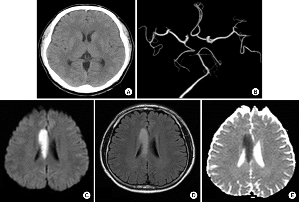 Fig. 2Brain imaging studies at first admission. Brain computer tomography (CT) (A), brain CT angiography (B), brain magnetic resonance imaging (MRI), diffusion weighted image (C), brain MRI, fluid attenuation inversion recovery (FLAIR) image (D), and brain MRI, apparent diffusion coefficient (ADC) map (E) shows acute infarction on right corpus callosum without major vessel obstruction.