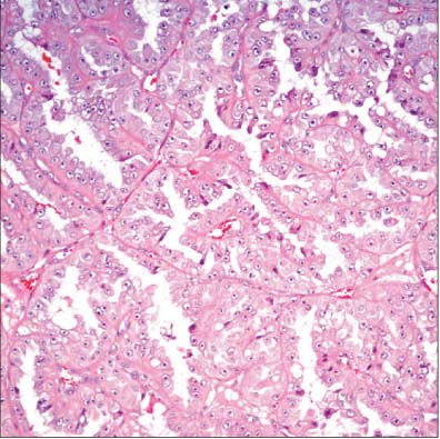 Hereditary leiomyomatosis and renal cell carcinoma syndrome. Large papillary-alveolar structures are lined by eosinophilic cells with enlarged nuclei and prominent inclusion-like nucleoli (Courtesy of Drs. Smith and Amin, Cedars-Sinai Medical Center, LA, CA, USA) (H&E, 200).