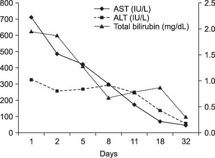 • 2. Kang SH, Kim JI, Jeong KH, Ko KH, Ko PG, Hwang SW, et al. Clinical characteristics of 159 cases of acute toxic hepatitis. Korean J Hepatol 2008;14:483-492.