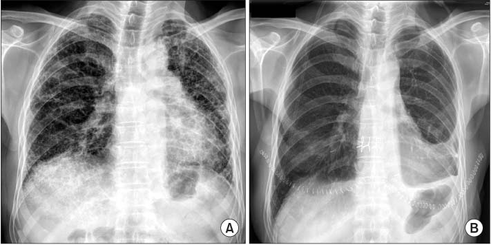 Fig. 1Chest X-ray taken before lung transplantation (LT) (A) and 7 days after LT (B). Chest X-ray shows no signs of pulmonary edema except for postoperative changes.