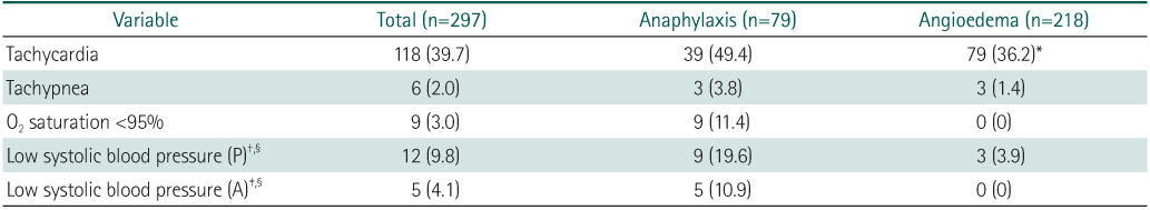 Values are presented as number (%). *P<0.05. †According to normal vital sign from Nelson Textbook of Pediatrics. ‡According to the Clinical Criteria for the Diagnosis of Anaphylaxis. §Total (n=122), anaphylaxis (n=46), angioedema (n=76).