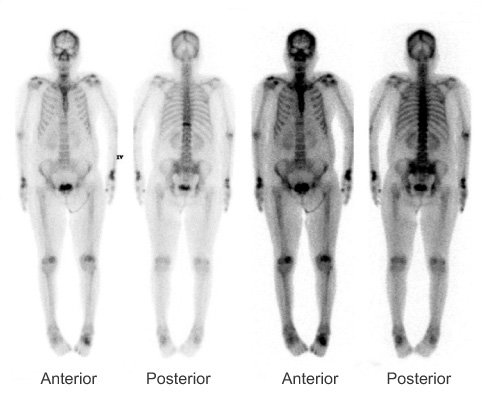 Whole body bone scan. It reveals increased uptake in the bilateral wrists, hands, and left tarsal bone, areas of arthritis.