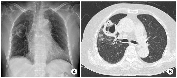 A 75-year-old female presented to the pulmonary department complaining of febrile sensation, cough and sputum for 2 weeks. She had a 15-year history of hypertension, diabetes mellitus, and osteoarthritis, and a 3-year history of adrenal insufficiency due to long-term intake of herb medication. She was taking 2.5 mg of prednisolone per day. Her heart rate was 90 beats per minute, respiration rate was 20 breaths per minute, and body temperature was 37.8℃. Auscultation of the chest revealed no abnormal lung and heart sounds. Laboratory findings revealed a white blood cell count of 12,440/µL (neutrophil 76.4%), C-reactive protein 56 mg/L, and glycated hemoglobin 7.5%. Chest X-ray revealed a cavitary lesion at right upper lobe. Chest CT scan showed a 4 cm-sized irregularwalled cavity with surrounding alveolar consolidation (