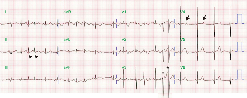 A baseline 12-lead surface electrocardiogram. Premature atrial complexes (arrowhead) with non-conduction (arrow) and aberrant conduction (asterisk) are shown. aVR, augmented vector right; aVL, augmented vector left; aVF, augmented vector foot.