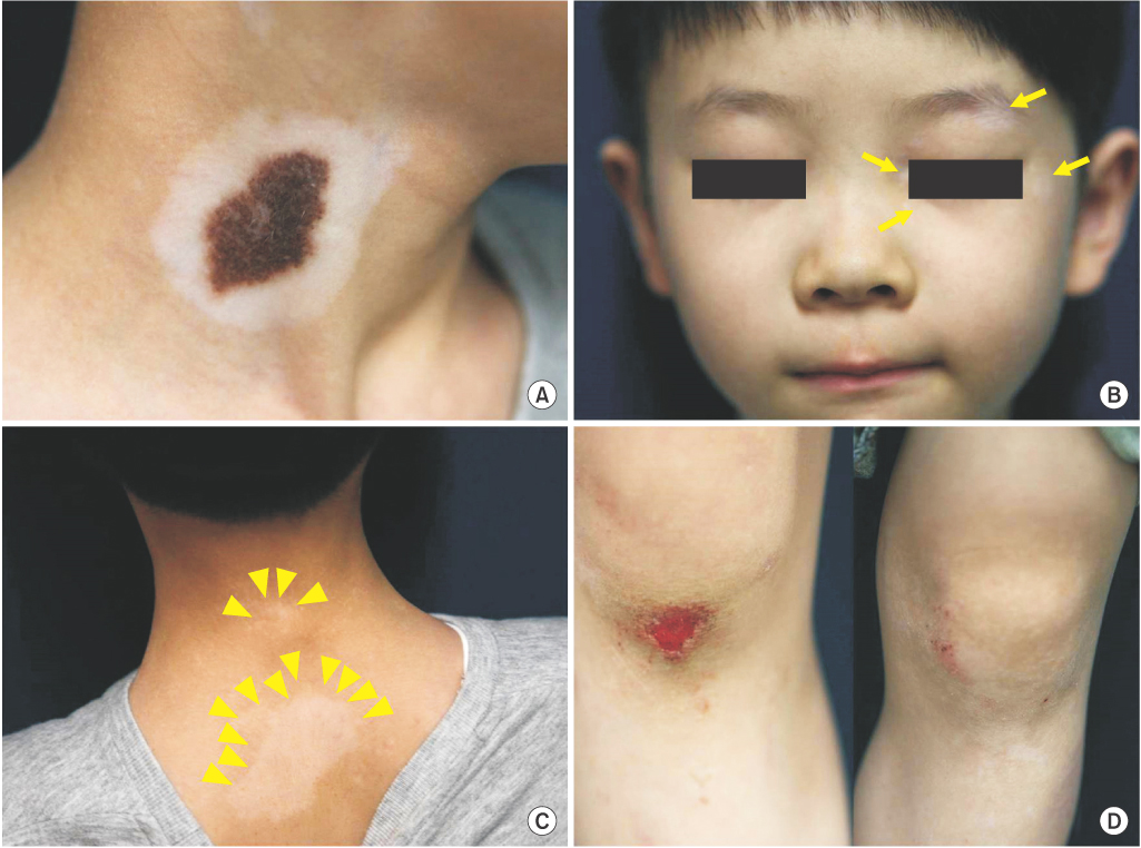 Fig. 1Clinical images at initial visit. (A) A 6 cm-sized patch with central pigmented hairy lesion surrounded by a whitish halo phenomenon on right neck. The whitish halo surrounding the congenital central lesion was developed 3 years in prior to visit. (B) Multiple variegated-shaped whitish patches on left periorbital area (arrows) where the corrective vision braces was in touch. Lesions had developed 1 year in prior to initial visit. (C) Multiple irregularly shaped whitish patches on posterior nape and upper back area (arrow heads). Lesions had developed 1 year in prior to initial visit. (D) Whitish patches around wound area of the right knee (right) and left knee (left). Lesions had developed 1 year in prior to initial visit.