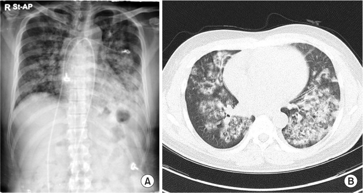 Fig. 1A chest radiograph and computed tomography image. (A) The radiograph shows bilateral patchy infiltrating shadows with consolidation. (B) The computed tomography image shows multiple and asymmetrical alveolar hemorrhage shadows.