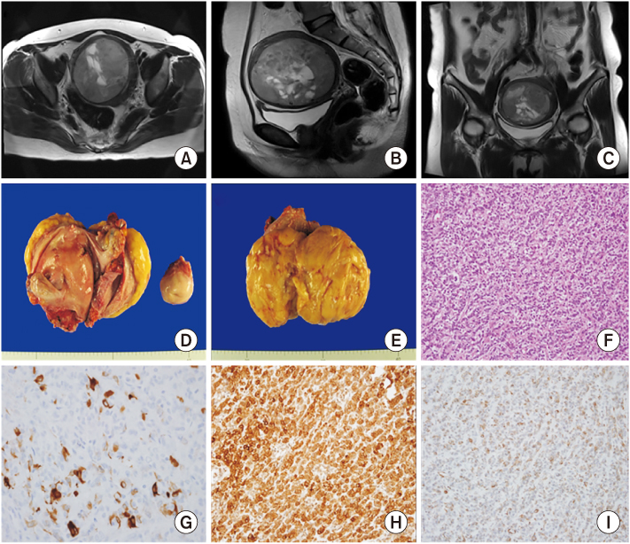 A 49-year-old Korean woman, gravida 2, para 2, visited our hospital due to vaginal bleeding that began 3 weeks ago. A heterogeneously enhancing solid mass with a clear margin was observed in the uterus on MRI. On T2-weighted images, the non-enhancing portion of the tumor was seen as necrotic or cystic tissue (Fig. 2A–C). Hysterectomy and bilateral salpingooophorectomy were performed under the diagnosis of degenerated uterine myoma. Macroscopic examination showed the presence of a large yellow mass measured as 9.0×7.5 cm. The cut surface of the mass was soft, yellow, and homogeneous (Fig. 2D, E).