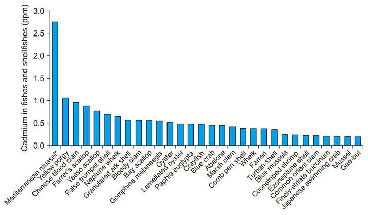 Thirty types of fish and shellfish with high cadmium concentrations. *Shellfish above the Korea Food and Drug Administration concentration standards for cadmium (2.0 ppm).