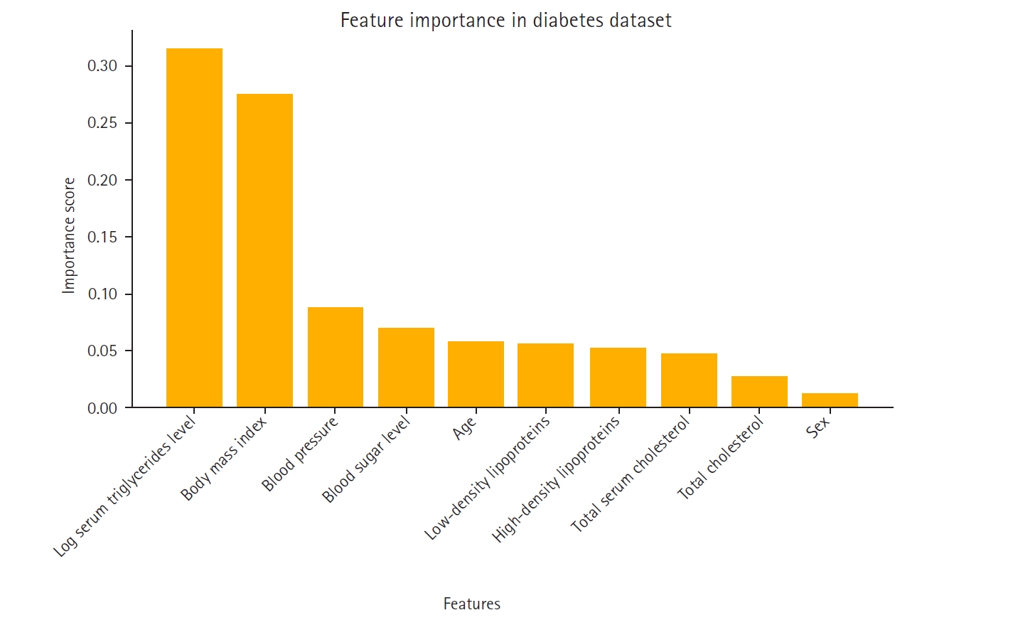 6]. The most significant predictors were log serum triglycerides level, body mass index, and blood pressure, while sex and high-density lipoproteins contributed the least to the model’s performance. The importance ranking of these features is visualized in