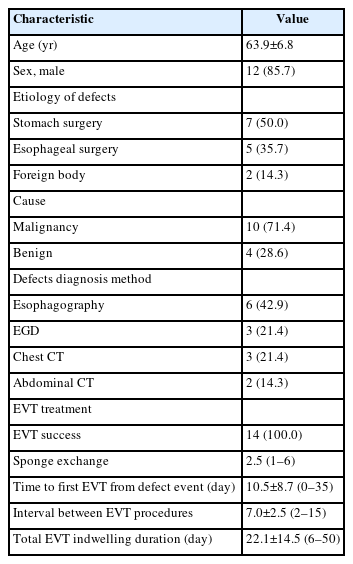 Fourteen patients were included in the study. The mean age was 63.9±6.8 years, and 12 patients (85.7%) were male. The most common etiology of perforation was stomach surgery (n=7; 50.0%), followed by esophageal surgery (n=5; 35.7%) and esophageal foreign body impaction (n=2; 14.3%). Regarding underlying disease, 10 patients (71.4%) had malignant conditions and 4 patients (28.6%) had benign conditions. Leakage was most frequently diagnosed by esophagography (n=6; 42.9%), followed by EGD (n=3; 21.4%), chest CT (n=3; 21.4%), and abdominal CT (n=2; 14.3%). The overall treatment success rate was 100% (14/14), with all patients achieving defect closure without requiring surgical revision or an alternative intervention. The median number of EVT sessions was 2.5 (range, 1–6), and the mean interval from surgery to the first EVT session was 10.5±8.7 days. The mean duration of EVT indwelling was 7.0±2.5 days (range, 2–15 days) (