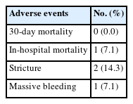 There was no 30-day mortality (0%). One patient (7.1%) experienced in-hospital mortality due to sepsis secondary to pneumonia, which was considered unrelated to the EVT procedure or gastrointestinal leakage. Adverse events occurred in a subset of patients: stricture developed in 2 patients (14.3%), and major bleeding occurred in 1 patient (7.1%) (